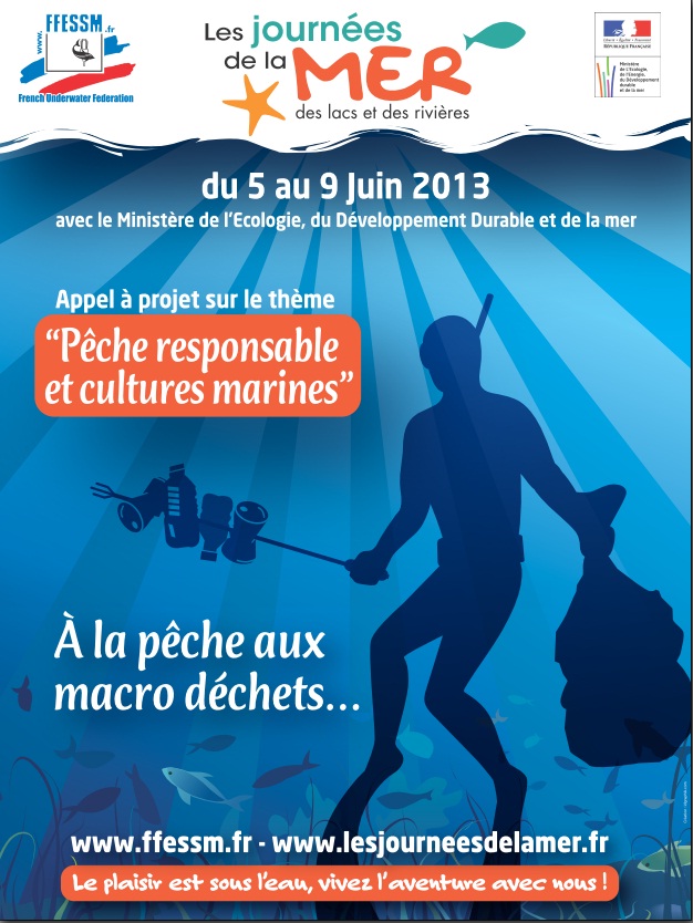 Vous trouverez ci-joint l'Affiche de participation FFESSM aux Journées de la mer pour soutenir le Ministère de l'Ecologie, du Développement Durable et de la Mer, journées prévues du 5 au 9 juin 2013, centrées aussi sur la journée mondiale des Océans du 8 juin.